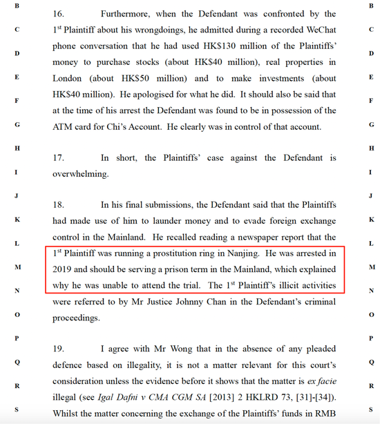 值得注意的是,判决书显示,本案受害人、原告于全利与妻子楼小洁并非普通人。香港法院在判决书中明确指出,于全利用于转账的1.3亿元“极可能来自有组织的非法卖淫活动”,而孙健荣作为专业金融顾问,对资金非法性“应当知情”。